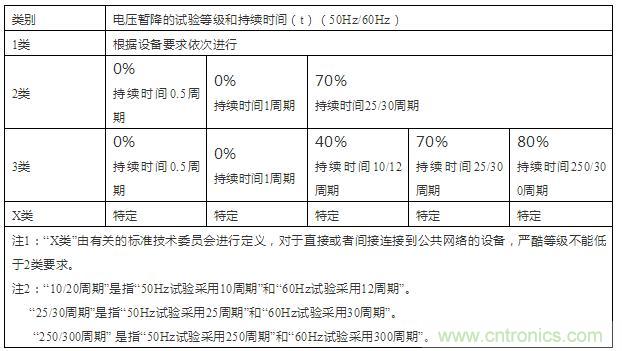 表1:電壓暫降試驗(yàn)優(yōu)先采用的試驗(yàn)等級和持續(xù)時間