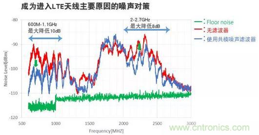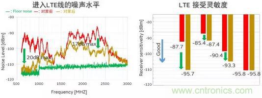 通過(guò)這些對(duì)策,如圖8所示,天線中進(jìn)入的噪聲最大可降低20dB,LTE的接收靈敏度取決于頻帶,改善了8dB。