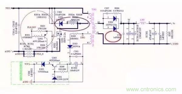 左邊綠色方框部分是驅(qū)動(dòng)電路,和之前LLC拓?fù)潋?qū)動(dòng)一樣,離MOS就近放置,原理圖上就體現(xiàn)出來(lái)。