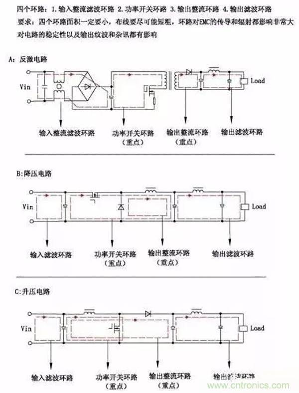 另外二大重要環(huán)路,一是MOS管開通環(huán)路(虛線紅色圖),另一個(gè)是MOS管關(guān)斷環(huán)路(實(shí)線紅色圖);環(huán)路面積盡可能??;