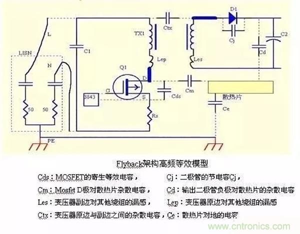 EMC的路徑,當(dāng)然空間輻射是跟環(huán)路有關(guān),環(huán)路也是路徑構(gòu)造成的;分析出反激高頻等效模型,幫助理解EMC形成的機(jī)理;我們的測(cè)試接收設(shè)備會(huì)從L,N端接收傳導(dǎo),為了減小接收的干擾,就必須讓干擾通過(guò)地回路流通而不從L,N端口流向接收設(shè)備;這時(shí)候我們的EMI電感以及Y電容通過(guò)阻抗匹配就可以實(shí)現(xiàn);另外原邊的干擾可以通過(guò)原副邊Y電容,變壓器雜散電容以及大地耦合到副邊,形成更多的回路;當(dāng)然一些結(jié)電容參數(shù),如MOS管結(jié)電容,散熱器結(jié)電容也能構(gòu)成流通路徑;