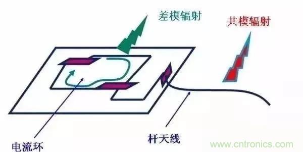 這個(gè)圖可能有些抽象,不過(guò)正好EMC是很難做到具體,需要給到我們一些啟示,可知:差模輻射是以環(huán)路的形式存在,而共模輻射是以天線的形式發(fā)射;因此正好印證前面說(shuō)我們布板的時(shí)候開關(guān)環(huán)路的布局以及走線的時(shí)候不要走銳角,常規(guī)走45度,最好是圓弧走線,當(dāng)然走線效率會(huì)比較低;