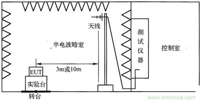 圖1所示是根據(jù)CISPR16、CISPR11、CISPR13、CISPR15、CISPR22及EN55022等標(biāo)準(zhǔn)要求的輻射發(fā)射測試布置圖,輻射發(fā)射測試時(shí),被測設(shè)備(EUT)置于半電波暗室內(nèi)部,在轉(zhuǎn)臺(tái)上旋轉(zhuǎn),在接收天線分別處于垂直極化和水平極化的情況下,找到最大的輻射點(diǎn)。輻射信號(hào)由接收天線接收后,通過電纜傳到半電波暗室外的接收機(jī)。