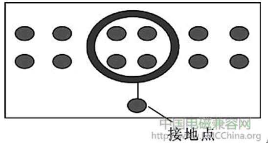(6) 為減少輻射,利用靜電屏蔽原理[6],對(duì)于敏感元件端頭可采用如圖(1)所示的抗干擾保護(hù)環(huán),并對(duì)保護(hù)環(huán)采用單點(diǎn)接地設(shè)計(jì),不接地的保護(hù)環(huán)是起不到屏蔽作用的。