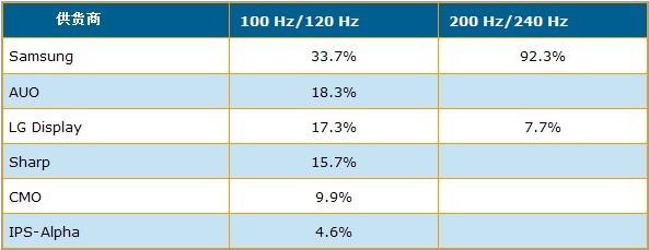 - Samsung出貨量市占率高達33.7%,AUO出貨量市占率18.3%