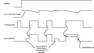 圖3顯示了采用2個(gè)以1A電流驅(qū)動(dòng)的LED閃光燈和1個(gè)以2A電流驅(qū)動(dòng)的LED閃光燈的測(cè)試結(jié)果。正如所見到的一樣,超級(jí)電容可以很容易地提供閃光持續(xù)120ms所需的電流,同時(shí)保持電源電壓充分地高于LED的VF電壓。在兩次閃光之間,超級(jí)電容以一個(gè)較慢的速率再充電,充電時(shí)間在外部設(shè)定,可針對(duì)不同的電池尺寸和化學(xué)原理進(jìn)行優(yōu)化。圖4顯示了閃光功能和電影模式選項(xiàng)的數(shù)字控制。