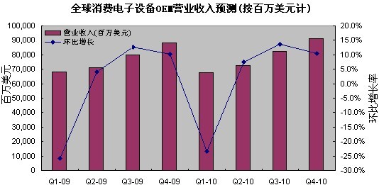 下圖所示為iSuppli公司對(duì)于各季度全球消費(fèi)電子設(shè)備營(yíng)業(yè)收入的預(yù)測(cè)。