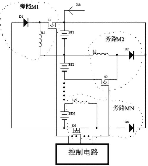4.運(yùn)用分時(shí)原理,通過開關(guān)組件的控制和切換,使額外的電流流入電壓相對(duì)較低的電池中以達(dá)到均衡充電的目的。該方法效率比較高,但控制比較復(fù)雜。