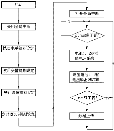 為了驗(yàn)證本文的均衡充電方法,以兩節(jié)單體電池組成的蓄電池組為例進(jìn)行實(shí)驗(yàn)和分析,主要驗(yàn)證旁路中開關(guān)管對(duì)電壓的調(diào)節(jié)作用??刂屏鞒桃妶D4。