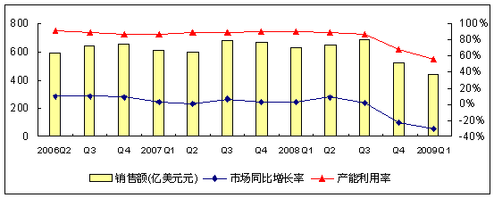 圖 2006Q2-2009Q1全球半導(dǎo)體市場規(guī)模和能利用率