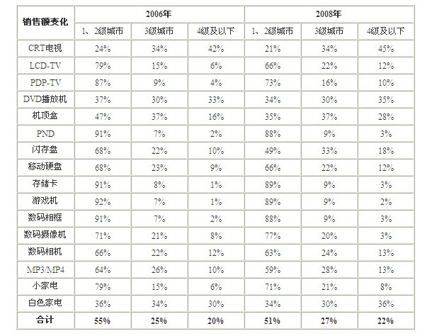 表1 2006年與2008年中國主要消費(fèi)電子終端產(chǎn)品不同級(jí)別城市銷售額結(jié)構(gòu)變化