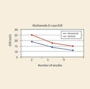 橫向和縱向結(jié)構(gòu)兩者ESR性能之間的差異如圖2所示。這個例子是基于對D類電容器的理論計算,圖2表明,兩陽極橫向結(jié)構(gòu)與三陽極系統(tǒng)的縱向結(jié)構(gòu)的ESR值相似。然而,相對而言橫向結(jié)構(gòu)在ESR上性價比優(yōu)勢更顯著。