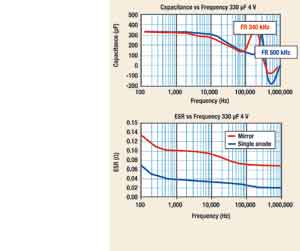 鏡像結(jié)構(gòu)如果使用更薄的陽極,電容將隨頻率下降至更低。鏡像設計的共振頻率改變,其原因是目前一般的DC/DC轉(zhuǎn)換器其開關頻率的工作范圍(250~500kH)會因降低ESL而顯著升高。