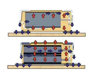 鏡像設計的另一個好處是改善了其散熱性能如圖4所示,紋波電流在陽極產(chǎn)生的熱量通過PCB板上的引線和鉭絲得以發(fā)散冷卻。
