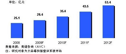 屏幕拼接市場已經(jīng)進(jìn)入快速成長期,據(jù)奧維咨詢(AVC)《中國大屏幕拼接市場研究報告》顯示,2008年中國市場規(guī)模約為25.1億元,2009年雖然遭遇經(jīng)濟(jì)大環(huán)境的影響,預(yù)計仍將增長17%左右,市場規(guī)模將達(dá)29.4億元。市場的成長主要得益于國家對能源、交通等基礎(chǔ)建設(shè)的大規(guī)模投入,以及09年全運(yùn)會、10年世博會、亞運(yùn)會等大型賽會事的拉動。
