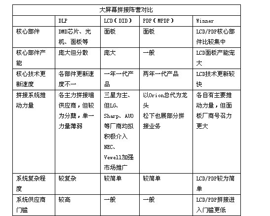 從以下對比表不難發(fā)現(xiàn),從技術(shù)層面來看,LCD技術(shù)占有綜合優(yōu)勢的地位,主要弱勢是拼接縫較寬,而DLP主要優(yōu)勢則在拼接縫最小,在色彩表現(xiàn)、分辨率、壽命等方面都有著較為明顯的缺陷。PDP則在防灼傷、分辨率方面相對較弱。