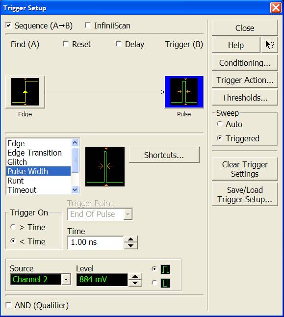 雖然許多問(wèn)題只需使用邊沿觸發(fā)便可以輕松找出,但是有時(shí)工程師必須使用更復(fù)雜的觸發(fā)。其中,最簡(jiǎn)單的觸發(fā)便是脈沖觸發(fā)。脈沖觸發(fā)被定義為一段高于(正脈沖)或者低于(負(fù)脈沖)某個(gè)閾值電平的時(shí)間。最常見(jiàn)的脈沖觸發(fā)是毛刺觸發(fā),它常用于對(duì)小于最小寬度的脈沖進(jìn)行觸發(fā)。這是一個(gè)違反觸發(fā)的實(shí)例,因?yàn)槭静ㄆ鳠o(wú)論在何時(shí)觸發(fā)都會(huì)指示出一個(gè)問(wèn)題。