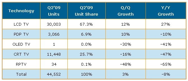 根據(jù)DisplaySearch最新發(fā)表的全球彩電出貨報(bào)告指出,2009年第二季全球出貨情況與第一季類似,全球電視機(jī)出貨量為4千460萬臺(tái),較去年同期下滑8%,而出貨金額較出貨量下滑情況大一些,第二季出貨金額僅達(dá)237億美元,較去年同期下滑12%。在各種顯示技術(shù)中只有LCD TV出貨量增加,同時(shí)較原先預(yù)期出貨成長(zhǎng)更高;其它應(yīng)用技術(shù)電視出貨量則是下滑的。從出貨金額來看,由于消費(fèi)者仍對(duì)經(jīng)濟(jì)復(fù)蘇與否存有疑慮,多數(shù)消費(fèi)者只對(duì)低價(jià)產(chǎn)品感興趣,因此所有應(yīng)用技術(shù)別電視出貨金額都是下滑的。