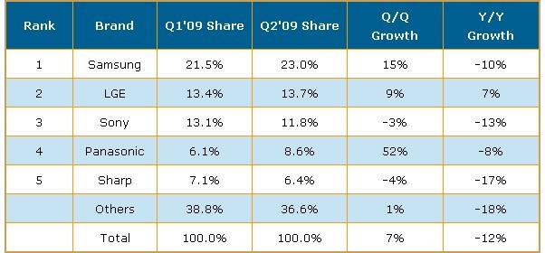 表二 Q2’09全球電視廠商按出貨金額排名與市占率
