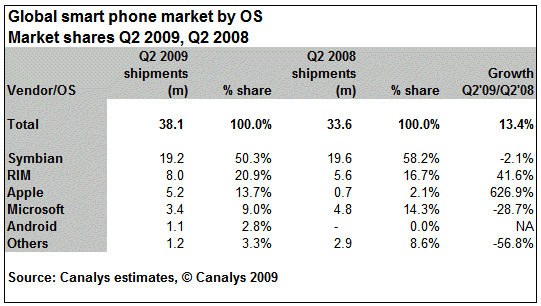 根據(jù)操作系統(tǒng)所統(tǒng)計(jì)的第二季全球智能手機(jī)市場份額中,Symbian系統(tǒng)智能手機(jī)銷量為1920萬部,同比減少2.1%,占整體智能手機(jī)銷量的52%;RIM操作系統(tǒng)智能手機(jī)銷量為800萬部,同比增長了41.6%;蘋果操作系統(tǒng)手機(jī)銷量為520萬部,同步增長626.9%;微軟操作系統(tǒng)手機(jī)銷量為340萬部,同比下降28.7%;谷歌Android操作系統(tǒng)手機(jī)銷量為110萬部。