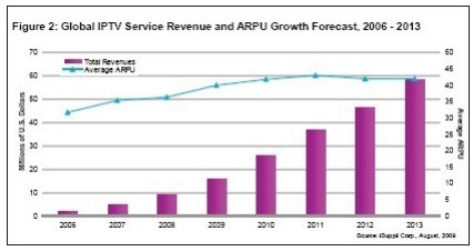 從營業(yè)收入角度來看,由于每用戶平均收入(ARPU)不斷上升,IPTV 的營業(yè)收入增長速度將比用戶數(shù)量增長還快。預(yù)計(jì)到 2013 年?duì)I業(yè)收入將從 2008 年時的 93 億美元上升到 582 億美元,其間的復(fù)合年增長率為 44.4%。圖 2 所示為 iSuppli 公司對 2006-2013 年全球IPTV 營業(yè)收入與每用戶平均收入的預(yù)測。