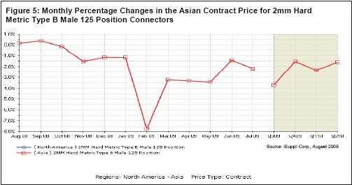 iSuppli公司認為,第二季度訂單比第一季度增長15-16%,出貨量增長7-9%。這種趨勢與其它商品市場一致。但是,連接器領(lǐng)域補充庫存的勢頭不太強。圖5所示為亞洲每月連接器合同價格的百分比變動率,以代表市場趨勢的未來四個季度預(yù)測。