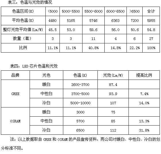 眾所周知,LED路燈的光效與色溫密切相關(guān)。從表四可看出,GREE芯片不同色溫的光效差別不大,但OSRAM芯片則不然,不同色溫的光效差別較大,6500K芯片比5700K芯片光效提高31.8%。因此,LED路燈必須在色溫與光效之間取得平衡,既要充分考慮市民的舒適感和滿意度,也不能為追求低色溫而大幅犧牲光效。畢竟,照度和功率密度值是《城市道路照明設(shè)計標準》(CJJ45-2006)的硬指標,必須有較高光效才能滿足要求。同時,由于不同色溫芯片的價格差別較大,成本因素也需要認真考慮。