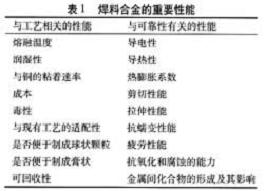 微電子領(lǐng)域使用的焊料有著很?chē)?yán)格的性能要求,無(wú)鉛焊料也不例外,不僅包括電學(xué)和力學(xué)性能,還必須具有理想的熔融溫度。從制造工藝和可靠性兩方面考慮,表1列出了焊料合金的一些重要性能。