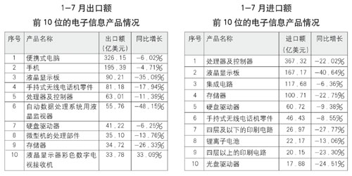 圖一:1~7月出口額(進口額)錢10位電子信息產品情況