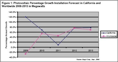 圖1所示為iSuppli公司對于2009至2013年加州以及全世界光伏系統(tǒng)安裝增長情況的預(yù)測。