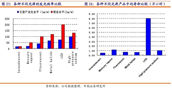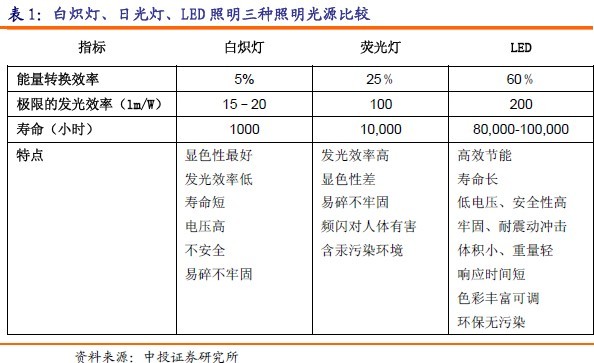 LED燈相對(duì)于其他光源有壽命長(zhǎng)、發(fā)光效率提高空間大的優(yōu)勢(shì),并且LED燈由于采用物理P-N結(jié)的冷發(fā)光原理,使得LED燈轉(zhuǎn)化效率高,也不存在汞燈污染源,被譽(yù)為綠色環(huán)保的照明能源并不為過(guò)。LED燈最高發(fā)光率為200流明/瓦,遠(yuǎn)高于其他的光源產(chǎn)品;其壽命理論值達(dá)到10萬(wàn)小時(shí),遠(yuǎn)遠(yuǎn)高于其他光源產(chǎn)品。