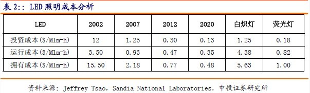 根據(jù)美國(guó)圣地亞國(guó)家實(shí)驗(yàn)室所做的LED照明成本分析,投資成本是將一個(gè)燈泡的購(gòu)買(mǎi)成本(每兆流明)分?jǐn)偟秸麄€(gè)壽命周期,運(yùn)行成本是指一個(gè)燈泡在運(yùn)行時(shí)的成本(每兆流明時(shí)),擁有成本是投資成本和運(yùn)行成本之和,反映了一個(gè)燈泡從購(gòu)買(mǎi)、運(yùn)行到壽終整個(gè)生命周期的總成本。到2010年LED的擁有成本降至0.77美元每兆流明時(shí),將低于熒光燈的1美元每兆流明時(shí),到2020年LED的擁有成本將降至0.48美元每兆流明時(shí),只有熒光燈的一半。