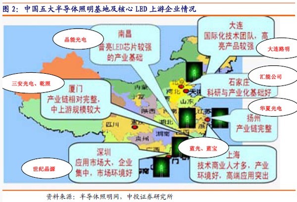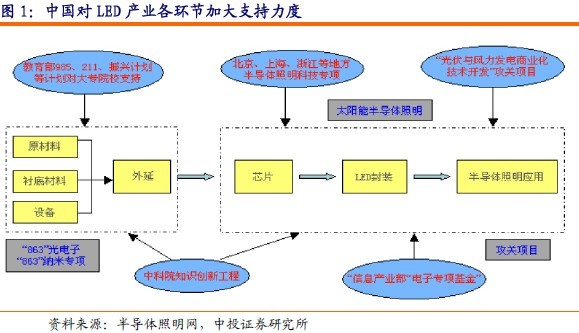 從2005年開(kāi)始科技部批準(zhǔn)了大連、廈門(mén)、上海、南昌、深圳等五個(gè)半導(dǎo)體照明產(chǎn)業(yè)基地,之后在2007年和2008年相繼批準(zhǔn)石家莊、揚(yáng)州等兩個(gè)半導(dǎo)體照明產(chǎn)業(yè)基地,在政策、稅收和資金上給予長(zhǎng)期支持。