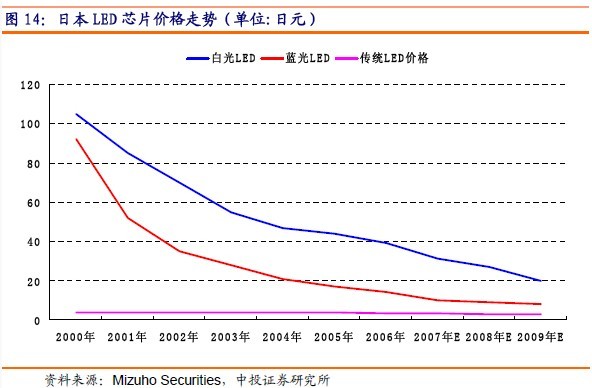 日本LED廠(chǎng)商供應(yīng)的白光LED價(jià)格已從2000年的每顆105日元(約1美元),下跌到2005年的44日元(不到0.5美元)、2009年的20日元;藍(lán)光LED價(jià)格從2000年的每顆92日元跌至2005年的17日元,預(yù)計(jì)2009年下降到8日元。預(yù)計(jì)2008年全年跌幅在10%左右。