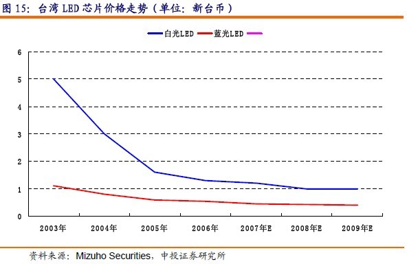 2004年臺(tái)灣廠(chǎng)商生產(chǎn)的藍(lán)光LED價(jià)格跌幅達(dá)到30%,2004年底藍(lán)光LED報(bào)價(jià)已跌至新臺(tái)幣0.60-0.80元,05年藍(lán)光LED的價(jià)格跌勢(shì)趨緩,全年跌幅在15%。預(yù)計(jì)08年全年跌幅在10%左右。