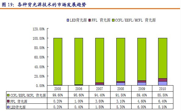 可以看出,從2006年到2008LED背光源的快速成長(zhǎng)期。如果按照2010年TFT-LCD市場(chǎng)銷(xiāo)售額950億美元,背光模組占其中20%計(jì)算,屆時(shí)背光模組的份額約為190億美元。據(jù)此推算,LED背光模組份額為15.39億美元,這是比較保守的估計(jì)。