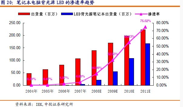 預(yù)計(jì)筆記本電腦的出貨量將從2004年的47.1百萬(wàn)臺(tái)增長(zhǎng)到2011年的223百萬(wàn)臺(tái),其中采用LED背光源的筆記本電腦將從2004年的0.1百萬(wàn)臺(tái)增長(zhǎng)到2011年的167百萬(wàn)臺(tái)左右,滲透率2011年將達(dá)到75%左右,而在2004年滲透率只有0.2%。其中每部筆記本電腦用LED顆數(shù)是40-60個(gè)。