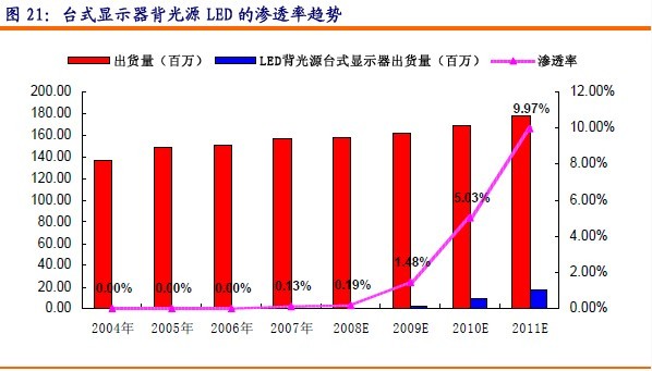 預(yù)計(jì)臺(tái)式顯示器的出貨量將從2007年的156.6百萬(wàn)臺(tái)增長(zhǎng)到2011年的177.5百萬(wàn)臺(tái),其中采用LED背光源的臺(tái)式顯示器將從2007年的0.2百萬(wàn)臺(tái)增長(zhǎng)到2011年的17.7百萬(wàn)臺(tái)左右,滲透率從2007年的0.1%上升到2011年的10%左右。其中每臺(tái)顯示器用lLED數(shù)量為60個(gè)左右。