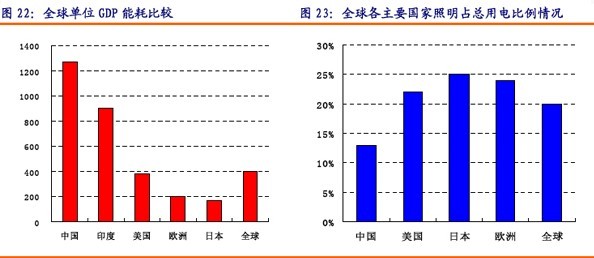 中國(guó)政府也已經(jīng)開(kāi)始實(shí)現(xiàn)照明節(jié)能計(jì)劃,目標(biāo)是到2010年每年降低能耗10%。在目前的照明用電占整個(gè)用電的比例中,可以看出中國(guó)照明用電比例低于全球主要經(jīng)濟(jì)發(fā)達(dá)國(guó)家,也低于全球的平均水平,說(shuō)明工業(yè)用電比例較高,從而使得單位GDP所消耗的能源明顯高于全球平均水平。