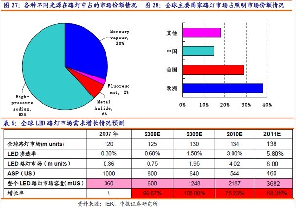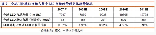 未來(lái)3-5年,LED路燈占全球LED市場(chǎng)份額將從2007年的1%上升到2011年的7%左右。