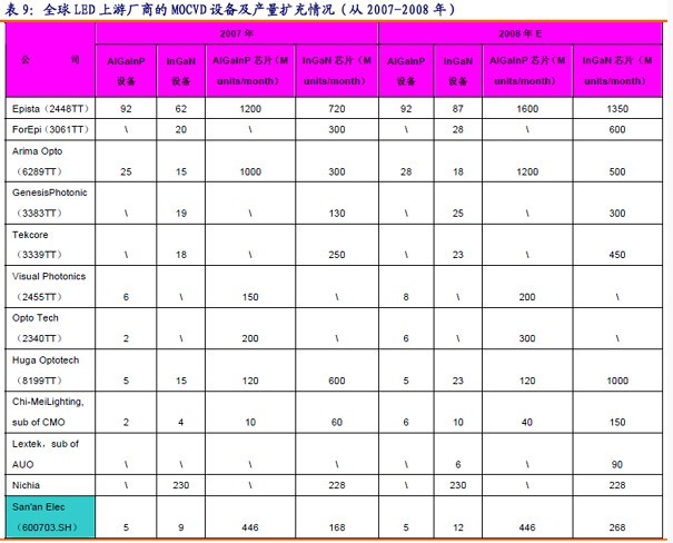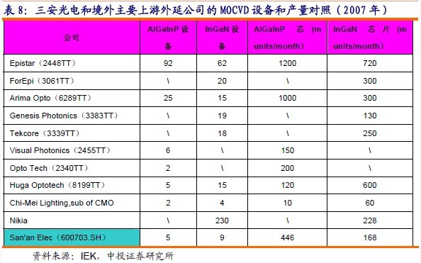 我們以截止2007年底為止,對(duì)三安光電和臺(tái)灣上游外延廠(chǎng)商的MOCVD設(shè)備及外延片、芯片產(chǎn)能進(jìn)行比較。