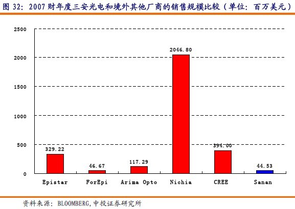 三安光電2007年的銷(xiāo)售規(guī)模為44.53百萬(wàn)美元,其規(guī)模和臺(tái)灣的璨圓光電規(guī)模相當(dāng),但和臺(tái)灣的晶圓光電、華上光電及美國(guó)的CREE公司相比,其銷(xiāo)售規(guī)模還有比較大的差距。