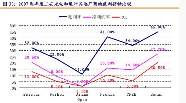 從盈利指標(biāo)來(lái)看,2007年度三安光電的銷(xiāo)售毛利率達(dá)到45%,凈利潤(rùn)率達(dá)到27.2%,REO為20.50%,遠(yuǎn)高于其他國(guó)際大廠(chǎng)的盈利指標(biāo)。其中可能的原因分析來(lái)看,國(guó)內(nèi)MOCVD設(shè)備折舊年限、國(guó)內(nèi)制造費(fèi)用先對(duì)較低、臺(tái)灣廠(chǎng)商進(jìn)入2008年實(shí)行股權(quán)、股票、分紅等激勵(lì)措施的原因造成國(guó)內(nèi)上游LED廠(chǎng)商的盈利能力平均高于國(guó)外廠(chǎng)商。