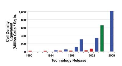 圖2顯示了Fairchild公司≤30V的N溝道MOSFET單元密度的進步。每個條形都表示新的工藝進步??梢钥吹?,在最近的十年中,單元密度從3200萬單元/平方英寸增加到現(xiàn)在的10億單元/平方英寸。