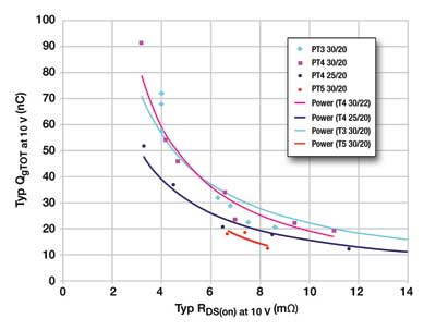 FOM=RDS(ON)×QgRDS(ON)直接與傳導(dǎo)損耗有關(guān),而Qg直接與開關(guān)損耗有關(guān)。FOM越小,性能越好。圖3顯示了低電壓MOSFET工藝發(fā)展中FOM的進步。對于2004年實施的PowerTrench3而言,最好的FOM是240,而今天的PowerTrench5硅工藝中最好的FOM是126。