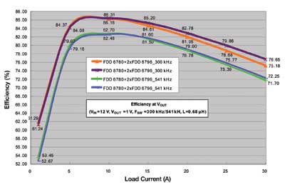 注意上面的兩條曲線,在滿載(30A)時,可以看到最新的器件的效率有1.5%的改進。同樣還是這兩條曲線,在負荷較?。?5A)時,可以實現(xiàn)0.69%的改善。如果對整個負荷范圍積分,那么與今天常見的方案相比,使用最新的MOSFET器件時平均功率損耗可以降低8%~10%。即使在較高的開關(guān)頻率541kHz處,可以看到在負荷小時系統(tǒng)級效率仍然高于80%,而在滿載時效率大于70%。如果頻率繼續(xù)增加,那么開關(guān)損耗將急劇增加。