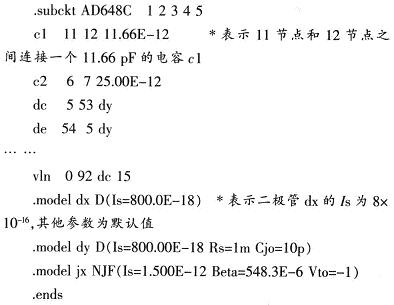 將此種的文本文件存為.lib的后綴名后,通過ModelEditor工具將該文件與器件符號聯(lián)系在一起,就可以使用在電路仿真中。圖5為AD648C的簡單運(yùn)用電路,從圖6瞬態(tài)分析結(jié)果可知建模正確。