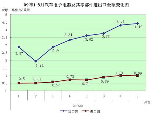 一、 2009年1-8月份國內(nèi)汽車電子電器產(chǎn)品出口量一路上揚