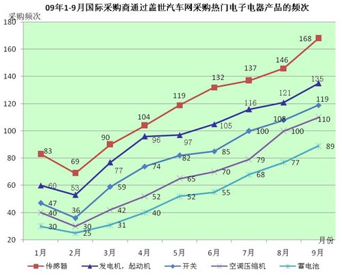與此相對應(yīng),據(jù)全球領(lǐng)先的專業(yè)汽車零部件電子商務(wù)平臺—蓋世汽車網(wǎng)的統(tǒng)計數(shù)據(jù)顯示,09年2-9月,國際采購商通過蓋世汽車網(wǎng)采購的汽車電子電器產(chǎn)品均呈現(xiàn)出大幅度增長之勢(如下圖所示)。其中,熱門采購產(chǎn)品主要有傳感器、發(fā)電機(jī)/起動機(jī)、開關(guān)、空調(diào)壓縮機(jī)、蓄電池等,平均每月采購頻次分別為120、100、82、 68、54以上。與2月份相比,9月份熱門采購產(chǎn)品的采購量增長幅度均達(dá)2-3倍。