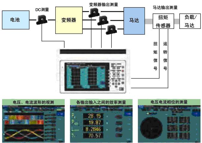 在強(qiáng)化新能源相關(guān)系統(tǒng)的開發(fā)和設(shè)備的節(jié)能化的進(jìn)程中,針對(duì)功率測(cè)量方面的要求涉及許多方面。圖1是變頻器馬達(dá)測(cè)量的典型例子,而且最近的動(dòng)向和測(cè)量需求的主要方面,可列舉出以下事項(xiàng):